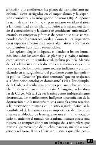 dígena sobre la descolonización y el medio ambiente. Este de la Cadena cuestiona la división entre naturaleza y cultu-