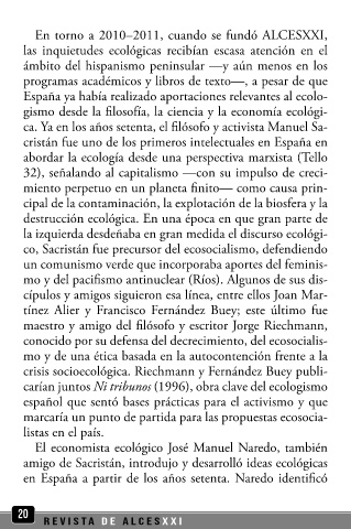 co, Sacristán fue precursor del ecosocialismo, defendiendo lectuales como Martínez Alier y Carlos Taibo han sido de-