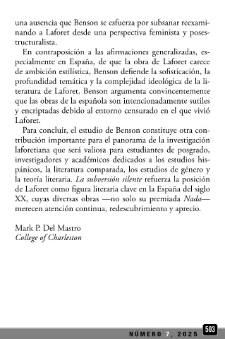 El marco crítico de Benson vincula la ficción de Laforet merecen atención continua, redescubrimiento y aprecio.