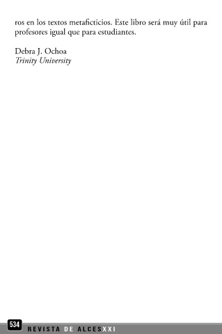ros en los textos metaficticios. Este libro será muy útil para profesores igual que para estudiantes. Debra J. Ochoa Trinity University 534 535 Revist a de al ce s XXI Número 7 , 2025