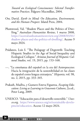 Plumwood, Val. “Shadow Places and the Politics of Dwe- tales) en Bates College (E.E.U.U.). Anteriormente, ocupó el puesto