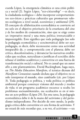 la emergencia climática supone una amenaza existencial, ma un acto político (López 29). En esta tarea, la pedagogía