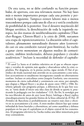 negarlo?) muy estrecho, pero la oportunidad para una ofen- 21 El canal La Sexta es el ámbito televisivo en el que se ofrecen repor-
